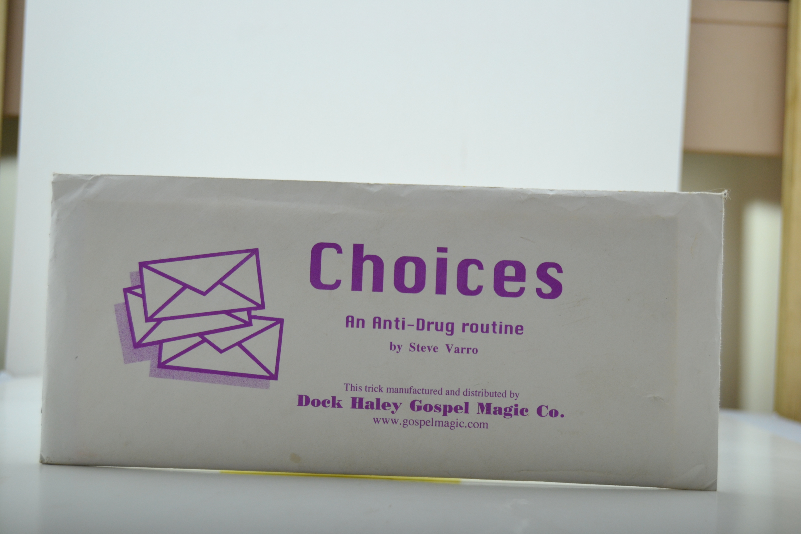 A member of the audience is asked to join the performer on stage. The performer explains that we are required to make choices every day throughout our lives and he would like for the helper to choose one of the three envelopes displayed. The helper is then asked to remove the paper from inside, while the performer reads the messages inside the envelopes not chosen. Those not chosen are wrong, or bad choices (drugs, alcohol or tobacco) while the message selected is read to reveal a positive message about choosing to remain drug free. A Gospel routine is included in the instructions.